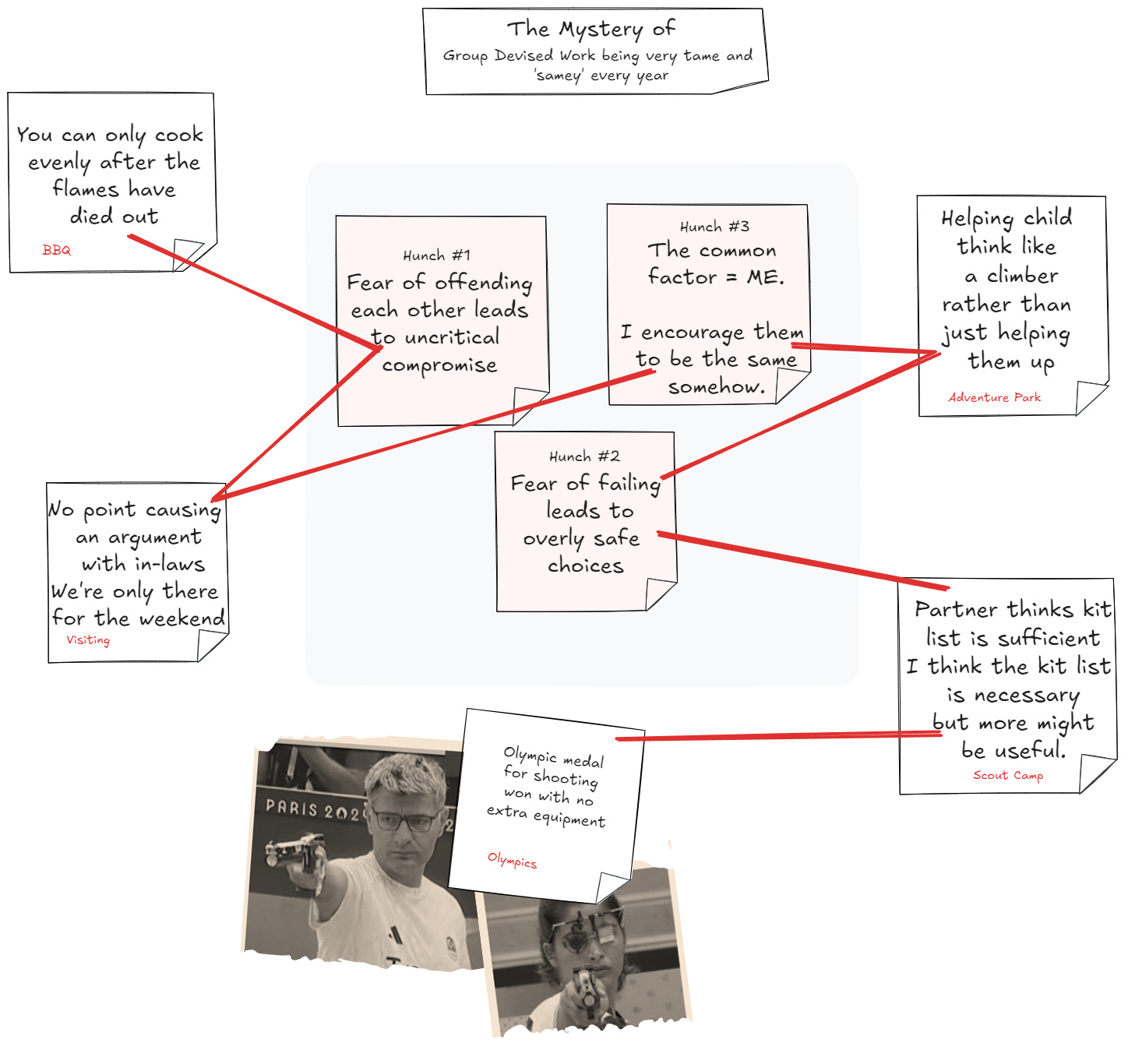 Add the clues to your evidence board and look for connections between them and your hunches. Mark the connections with arrows, string, or ribbon. Some might be obvious - using questions to help the climber consider their options clearly links to a hunch that I give the wrong kind of advice. Other links might require a bit of thought - but not too much. Again, it's best not to over intellectualise. This exercise is about lateral thinking rather than logical analysis. Most of the work will happen unconsciously.