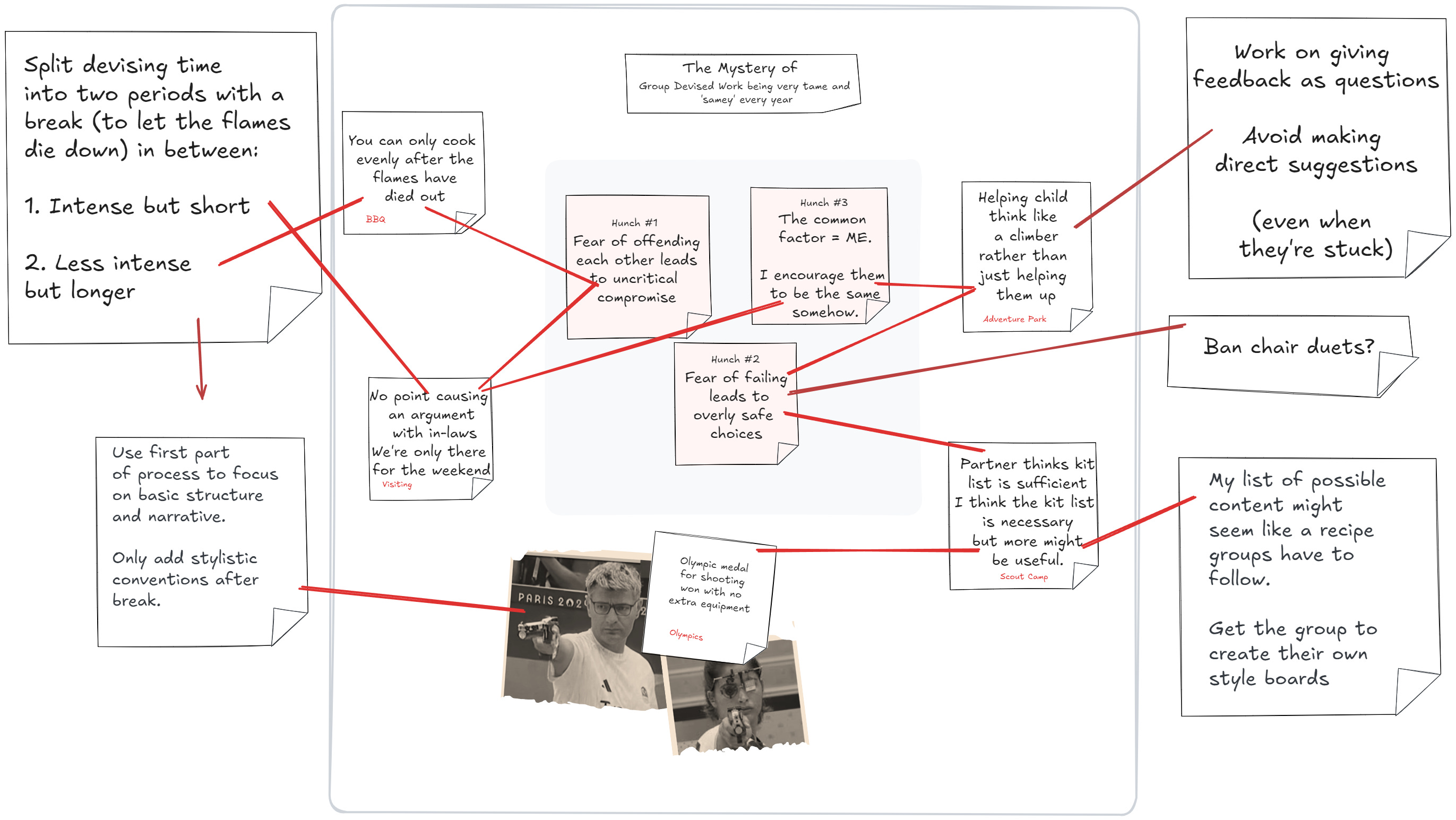 The outer ring is the place for practical ideas that are inspired by the clues and hunches. This is the stuff you might actually apply to your practice. Sometimes these ideas jump straight out of one the clues (or even one of the hunches) in which case they can be added as you go. More often the practical ideas occur once the board has begun to fill up. The art at this stage is to consider the relationship suggested by the clue and translate this to your practical context. For instance: