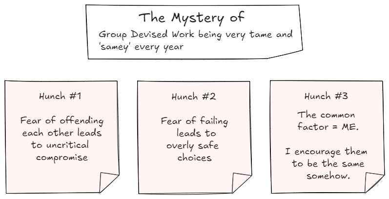 Of course, at heart, this is a systemic issue, common across all facilitation work that fails to recognise the time required to reflect, develop and update practice. In thrall to an industrial myth, that a production line only needs to be set up once to consistently deliver the 'goods', funders and employers typically focus on hours of visible 'delivery'.