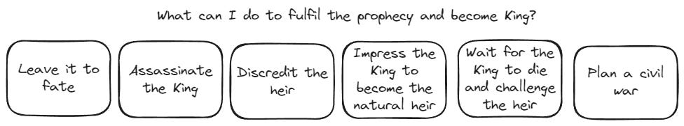 Considering the 'roads not taken' is useful in two distinct ways. Firstly, it challenges determinism - the notion that the events on stage are the inevitable consequence of previous actions. In this way, the exercise aligns with the Brechtian technique of “Fixing the not…but…"2 . Secondly it provides an opportunity to move beyond the dualism of Brecht’s not/but to a complex hypothecation of both the range of options open to the character and the criteria used to decide what to do first. If we were to consider, for instance, Macbeth's decision to kill King Duncan when he visits Inverness, a simple not/but analysis shows the protagonist choosing: