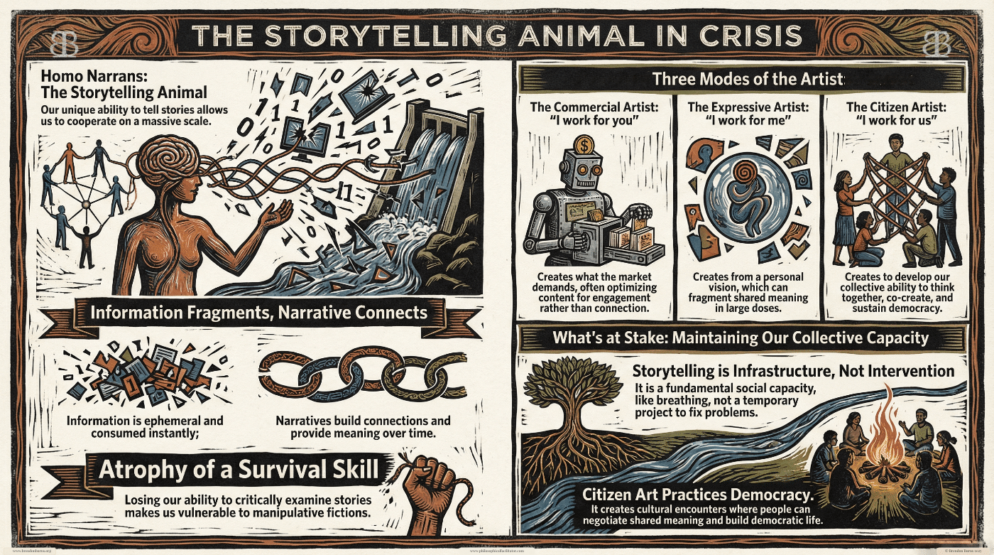 Humans are uniquely able to coordinate at massive scale through shared stories - but that capacity is under threat. This framework argues that storytelling isn’t just creative expression or market commodity; it’s fundamental democratic infrastructure. The three modes of artistic contribution - Commercial Art, Expressive Art, and Citizen Art - represent different relationships between artists and society. Only Citizen Art maintains storytelling as a collective capacity rather than individual consumption. This framework clarifies what’s at stake when our ability to create shared meaning atrophies.