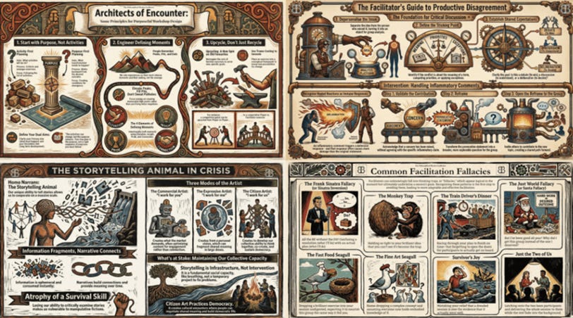 This is a really valuabe collection. The framing around workshops as designed transformation rather than just activity selection is a perspective shift I've been circling around but hadn't seen articulated so cleanly. I really appreciate how the strategic euphemism method gives concrete steps for when things get heated instead of just vague advice to "stay calm." Bundling a year's work into navigable maps like this makes all the ideas way more usable thatn individual posts scattered across months.