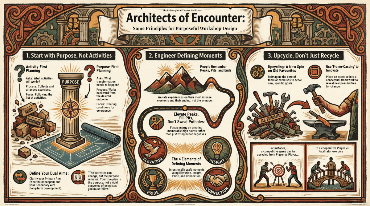 Workshop design often defaults to selecting activities rather than clarifying purpose. This framework argues for starting with what transformation needs to happen, then working backward to create the conditions for emergence. Whether you’re planning drama workshops, deliberative forums, or applied theatre projects, these principles help ensure your design serves participant needs rather than facilitator habits.