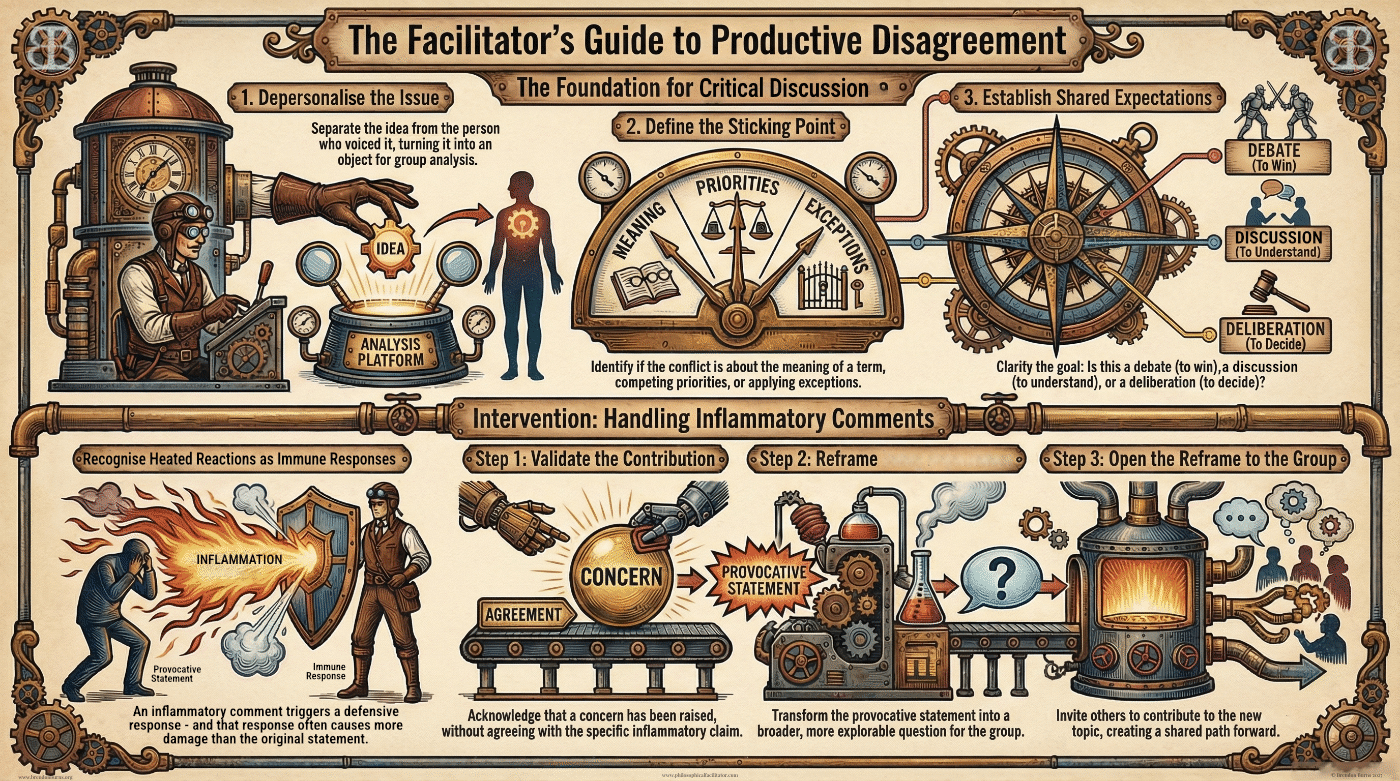 Handling controversial topics requires more than good intentions - it demands strategic preparation and reactive techniques. This framework consolidates the year’s work on discourse facilitation into one navigable system: foundational principles for laying groundwork before controversy emerges, and anti-inflammatory techniques for managing flare-ups when they occur. The strategic euphemism method offers a specific three-step approach for keeping conversations productive when inflammatory language threatens to derail them.
